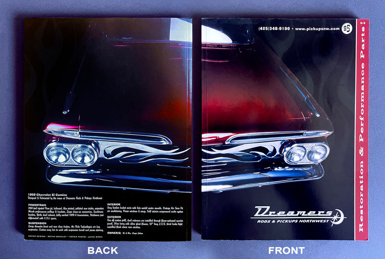 Freelance design project for the cover of Dreamers Rods & Pickups performance parts catalog. The cover features a custom El Camino that was built and painted by Dreamers. There's ghost flames in the car paint and I carried that theme over to having ghost flames in the black background behind the car as well. The inner left page of the cover was inspired by 50's era advertising. I also created Dreamer's logo, letterhead, signs, t-shirts and advertising